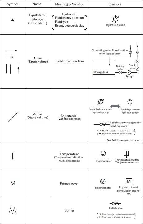 The arrows used in functional elements are straight horizontal or vertical arrows that represent the "direction of fluid flow," while diagonal arrows are symbols that indicate "variable operation is possible."