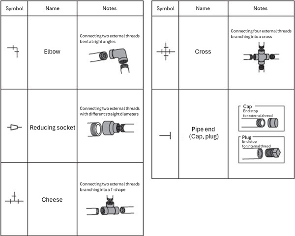 The symbol for a fitting is basically a straight line with a short line drawn on it, just like a threaded connection, but the same short line symbol is also used for caps and plugs that are attached to the end of pipes.