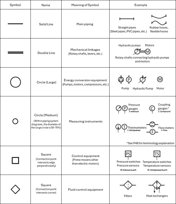 For example, piping is a solid line, but when it becomes a double line, it becomes a connected device such as a rotating shaft, and even though they are the same circle, a large circle indicates an energy converter and a small circle indicates a measuring instrument. Be careful not to confuse similar symbols.