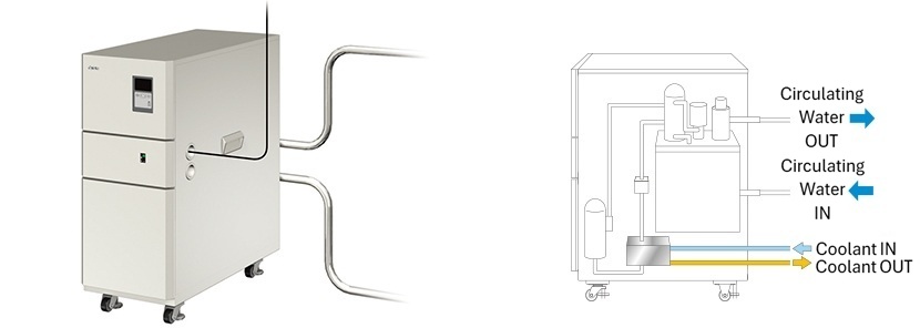 The inside of a chiller unit consists of freezing cycle in which refrigerant circulates and a water circuit in which chilled water circulates, and there are two types of refrigerant cooling methods: Air-cooling type and water-cooled.