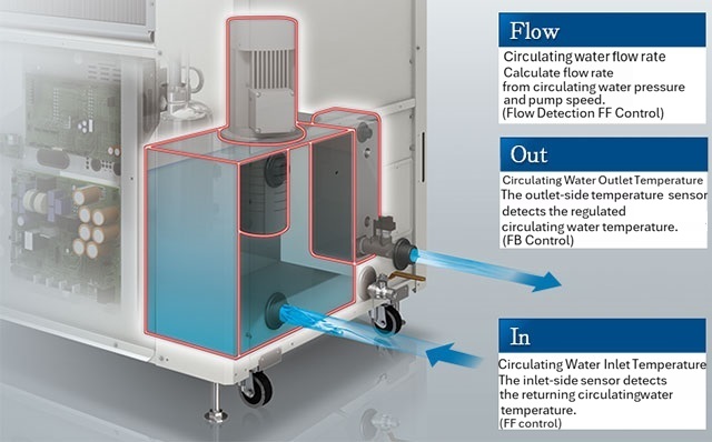 There are various ways to reduce power consumption of existing chillers. Adjusting the inlet and outlet temperatures and flow rate of circulating water to suit usage conditions is an effective way to save energy on chillers, but if changing the settings is difficult, consider installing a control system.