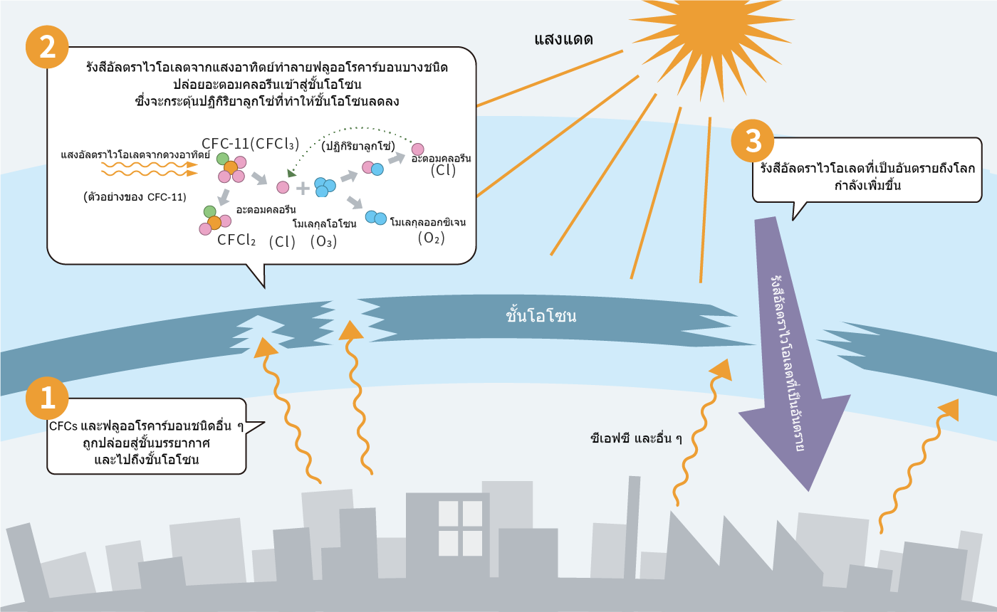 ในช่วงกลางทศวรรษ 1970 มีการชี้ให้เห็นว่าสารสังเคราะห์ เช่น คลอโรฟลูออโรคาร์บอน (CFCs หรือที่รู้จักกันในชื่อฟลูออโรคาร์บอน) สามารถทำลายชั้นโอโซนได้ ฟลูออโรคาร์บอนหลายชนิดเคยถูกนำมาใช้ในเครื่องปรับอากาศ ตู้เย็น สเปรย์ และผลิตภัณฑ์อื่นๆ และถูกปล่อยสู่ชั้นบรรยากาศในปริมาณมาก เนื่องจากฟลูออโรคาร์บอนสลายตัวได้ยากใกล้พื้นดิน จึงถูกพัดพาโดยกระแสบรรยากาศขึ้นสู่ชั้นสตราโตสเฟียร์ เมื่อถูกพัดพาขึ้นสู่ชั้นสตราโตสเฟียร์ที่ระดับความสูงประมาณ 40 กิโลเมตร พวกมันจะถูกสลายตัวโดยรังสีอัลตราไวโอเลตจากดวงอาทิตย์ที่รุนแรง ก่อให้เกิดคลอรีน คลอรีนนี้ทำหน้าที่เป็นตัวเร่งปฏิกิริยา ทำลายโอโซนทีละชั้น นอกจากฟลูออโรคาร์บอนแล้ว ยังมีสารอื่นๆ อีกหลายชนิดที่ทำลายชั้นโอโซน โบรมีนที่ปล่อยออกมาจากสารต่างๆ เช่น ฮาลอน ซึ่งใช้ในสารดับเพลิง ก็ทำลายชั้นโอโซนเช่นกัน