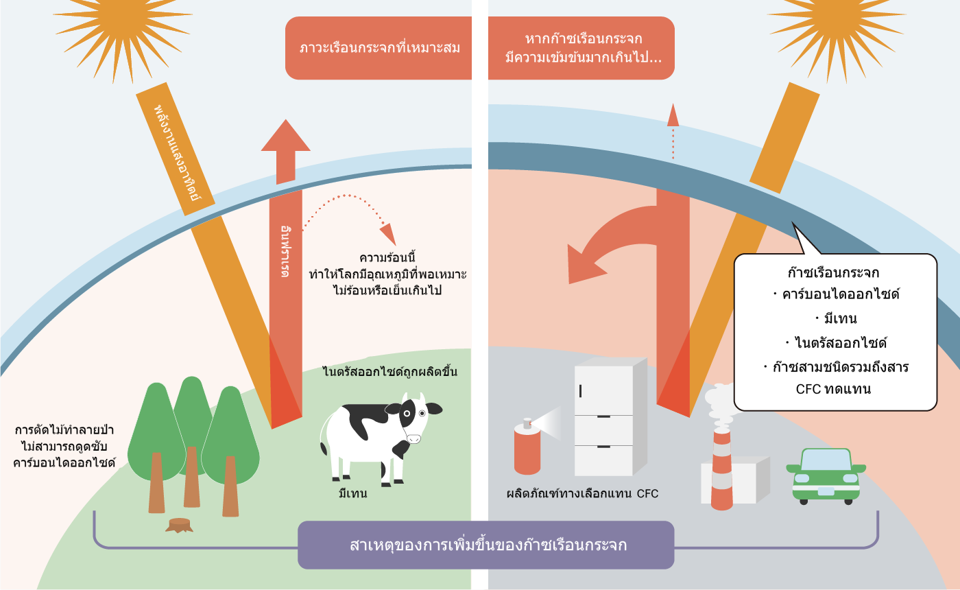 ก๊าซเรือนกระจก เช่น คาร์บอนไดออกไซด์ที่มีอยู่ในชั้นบรรยากาศ มีคุณสมบัติในการกักเก็บความร้อนที่เดินทางจากพื้นผิวโลก เช่น มหาสมุทรและผืนดิน ไว้ในชั้นบรรยากาศ และสะท้อนกลับคืนสู่พื้นผิวโลก (ปรากฏการณ์เรือนกระจก) นับตั้งแต่การปฏิวัติอุตสาหกรรมเริ่มต้นขึ้นในช่วงกลางศตวรรษที่ 18 ก๊าซคาร์บอนไดออกไซด์จำนวนมากถูกปล่อยสู่ชั้นบรรยากาศ เนื่องจากการใช้เชื้อเพลิงฟอสซิล เช่น ถ่านหินและน้ำมันจำนวนมากในกิจกรรมอุตสาหกรรม และการผลิตปูนซีเมนต์จำนวนมาก ประกอบกับการลดลงของพื้นที่ป่าไม้ ซึ่งทำหน้าที่ดูดซับคาร์บอนไดออกไซด์ในชั้นบรรยากาศ ส่งผลให้ความเข้มข้นของก๊าซเรือนกระจกในชั้นบรรยากาศเพิ่มขึ้นอย่างรวดเร็ว การเพิ่มขึ้นอย่างรวดเร็วของก๊าซเรือนกระจกนี้ทำให้ปรากฏการณ์เรือนกระจกในชั้นบรรยากาศรุนแรงขึ้น ส่งผลให้การดูดซับความร้อนในชั้นบรรยากาศเพิ่มขึ้น ส่งผลให้อุณหภูมิเริ่มสูงขึ้นตั้งแต่กลางศตวรรษที่ 20 ซึ่งเชื่อกันว่าเป็นสาเหตุของภาวะโลกร้อน