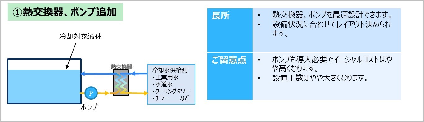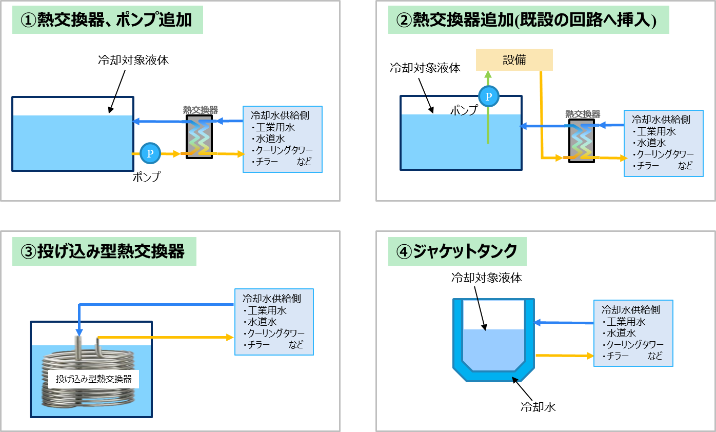 วิธีการนี้เกี่ยวข้องกับการเพิ่มตัวแลกเปลี่ยนความร้อนและปั๊มลงในถังของเหลวที่จะทำความเย็น สร้างวงจรหมุนเวียนใหม่ แล้วจึงระบายความร้อนทางอ้อมด้วยน้ำหล่อเย็น แม้ว่าจะต้องใช้ตัวแลกเปลี่ยนความร้อนและปั๊มเพิ่มเติม แต่ก็สามารถเลือกส่วนประกอบต่างๆ ได้ตั้งแต่ต้น เพื่อให้เหมาะสมกับคุณสมบัติและคุณสมบัติทางกายภาพของของเหลวที่จะทำความเย็น นอกจากนี้ยังสามารถกำหนดรูปแบบการจัดวางได้อย่างยืดหยุ่นเพื่อให้เหมาะสมกับสถานการณ์ปัจจุบัน