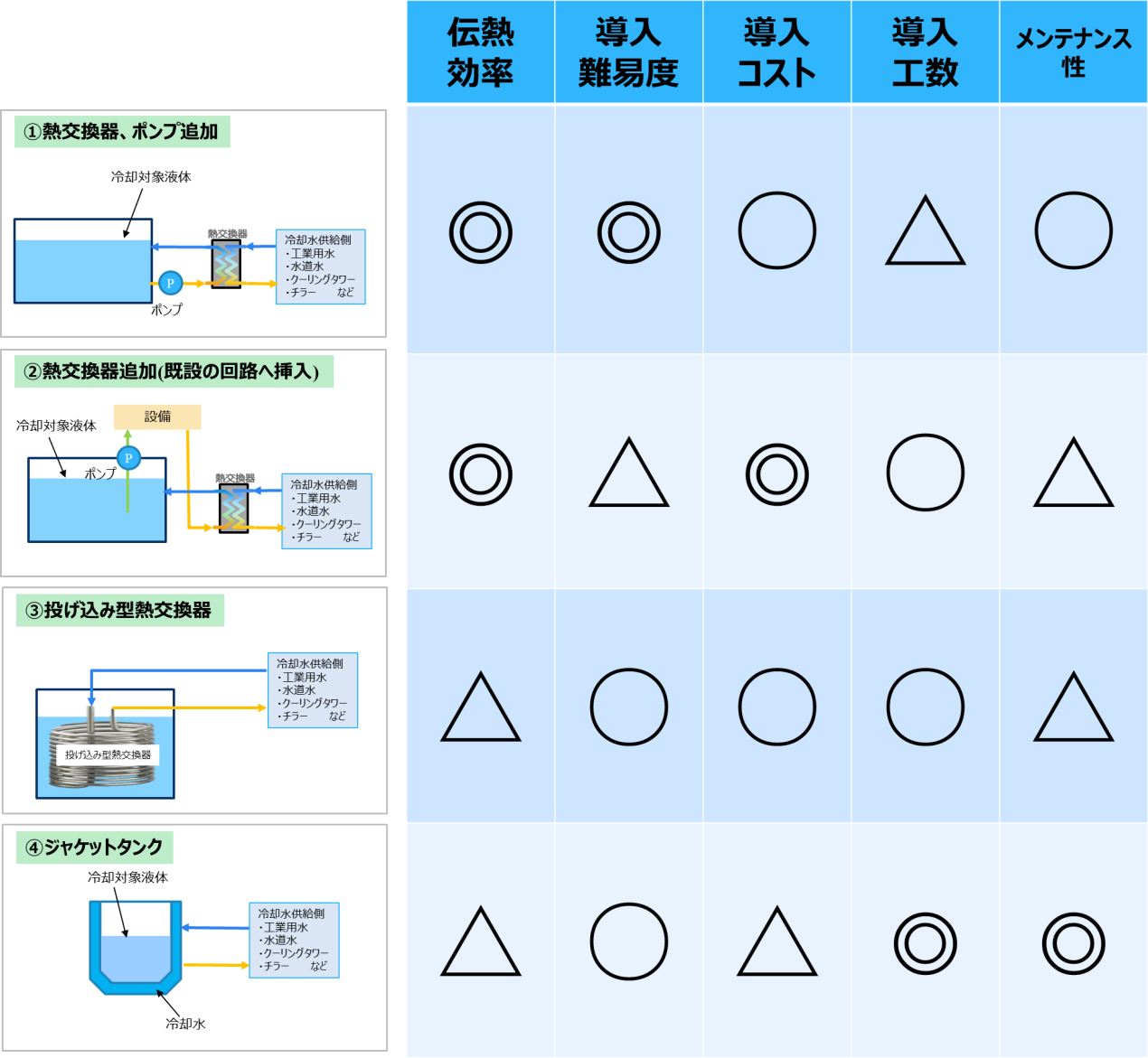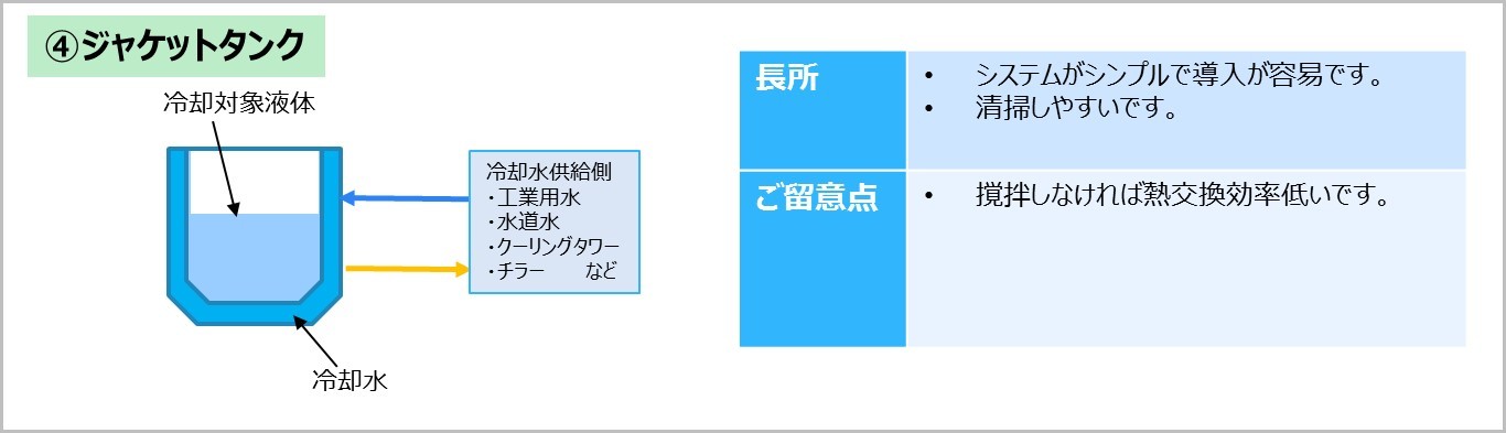 วิธีนี้เกี่ยวข้องกับการไหลน้ำหล่อเย็นผ่านแจ็คเก็ตของถังแจ็คเก็ตเพื่อทำให้ของเหลวในถังด้านในเย็นลง ระบบนี้เองนั้นเรียบง่าย จึงติดตั้งง่าย และถังด้านในยังทำความสะอาดง่ายอีกด้วย