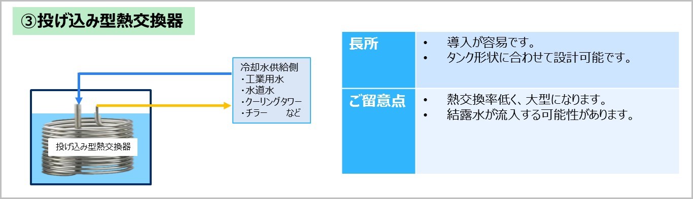 วิธีนี้ติดตั้งง่ายเนื่องจากตัวแลกเปลี่ยนความร้อนจะจุ่มอยู่ในถัง อย่างไรก็ตาม ประสิทธิภาพการทำความเย็นจะต่ำกว่าวิธีที่ 1 และ 2 ที่กล่าวมาข้างต้น ดังนั้นตัวแลกเปลี่ยนความร้อนจึงมีขนาดใหญ่ขึ้น และในบางกรณีจำเป็นต้องมีการกวนเพื่อเพิ่มประสิทธิภาพการถ่ายเทความร้อน นอกจากนี้ หากน้ำหล่อเย็นเย็นกว่าอุณหภูมิภายนอกมาก อาจเกิดการควบแน่นบนตัวแลกเปลี่ยนความร้อนและท่อ และน้ำที่ควบแน่นอาจไหลเข้าไปในของเหลวที่กำลังถูกทำความเย็น