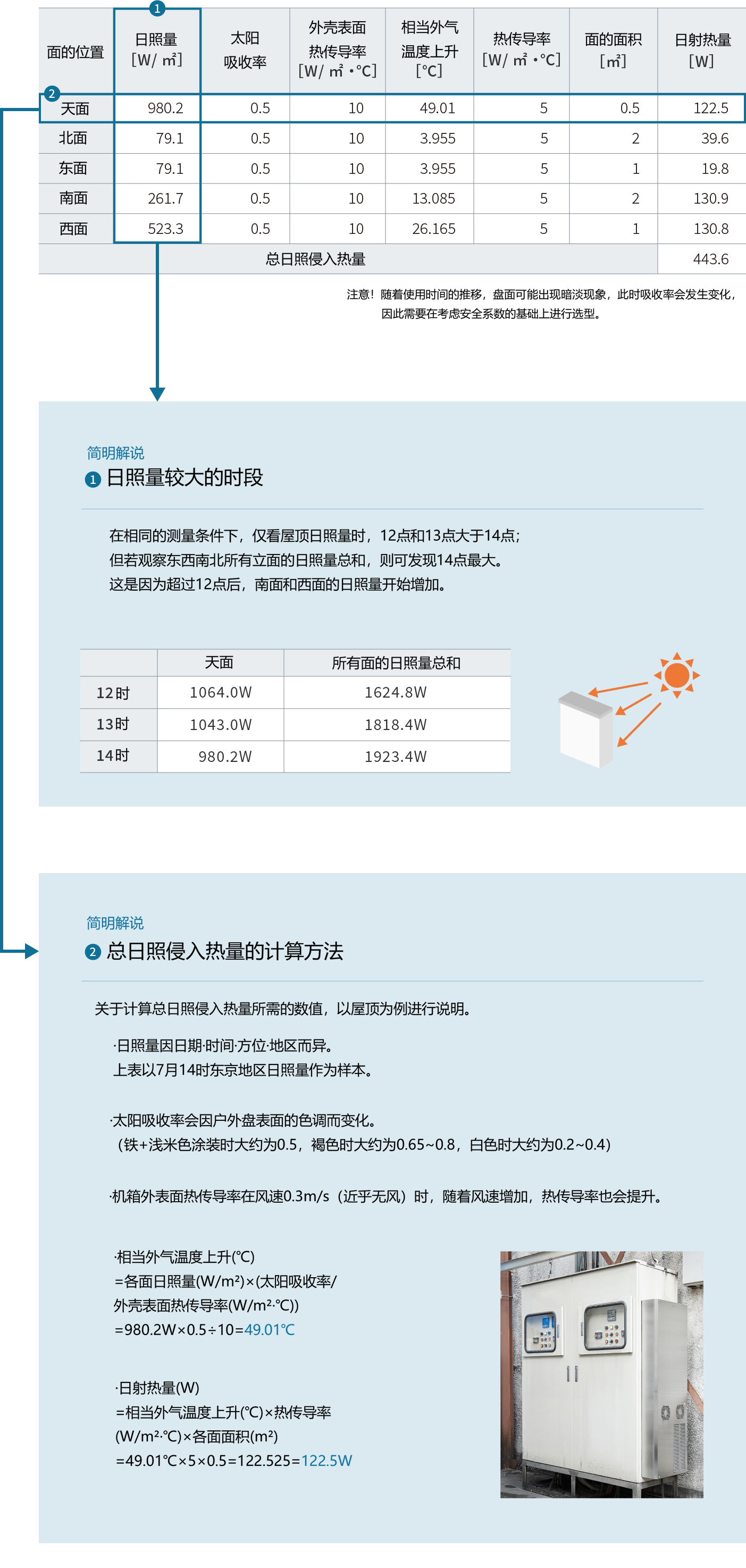 室外控制柜的太阳辐射量(=总太阳热穿透量)取决于安装的地区和时间、外壳表面的颜色/材料/厚度、外壳结构(双层结构、遮阳板的安装等)以及周围的通风条件。
