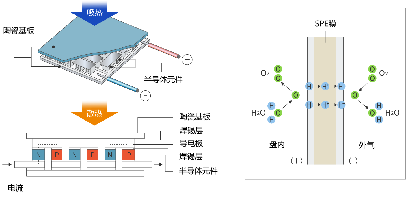 使用珀耳帖帖元件的除湿机很常见。它们通过在珀耳帖元件的冷却板侧产生冷凝来去除湿气。除湿能力估计约为10至30 cc/h。然而,在冬季,冷却板上没有温差,因此除湿效果几乎为零。市面上也有不使用珀耳帖帖元件的电解除湿机。