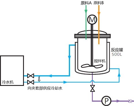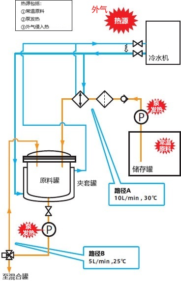 前提:如下图所示,在混合原料的反应过程中,由于现有冷却器的制冷能力不足,导致混合原料的温度上升。请计算冷却不足量(温度上升产生的热量)。