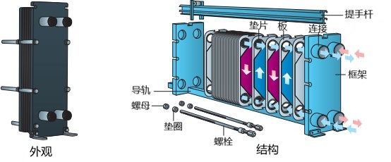 两种液体在堆叠的导热板之间流动以进行热交换的基本结构与制动板相同,但这是一个很大的特点,板之间用橡胶垫片隔开,整体可以拆卸是的。