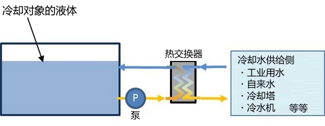将管状的热交换器直接浸入冷却对象液体的罐中进行热交换。不需要冷却液体的循环路径,易于部署。