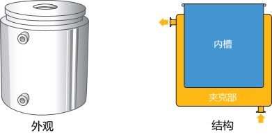 是外槽 (夹套部) 包裹内槽的双层构造,使调整了温度的水在外槽 (夹套部) 循环,对内槽进行冷却、加温、保温。