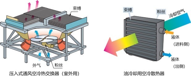 空冷式热交换器的结构主要由管束(翅片管等)和风扇组成。需要冷却的液体在管束中流通,风扇将空气吹过管束,利用液体与空气之间的温差,使液体冷却(散热)。