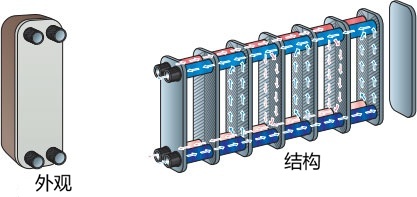 是在重叠的传热板之间,高温和低温液体交替流动进行热交换的构造。高温和低温液体在板之间的间隙中交替流动,可以有效地进行热交换,并且可以充分利用微小的温差。