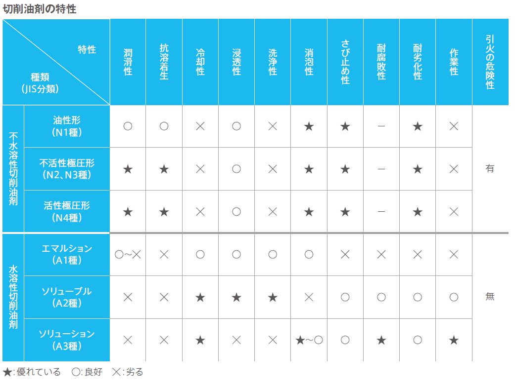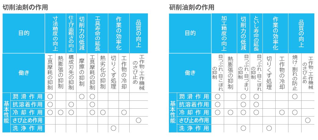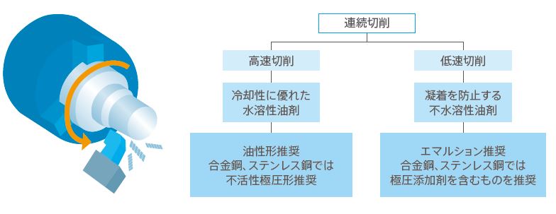 另外,即使是不同的被削材料,也需要根据目的进行选择。例如,对于要求润滑性的钢,适用乳液;对于要求冷却性的铸铁,适用Solutions;对于不锈钢和耐热钢等容易发生熔接的切削材料,适用含有提高抗熔接性的极压添加剂的乳液。