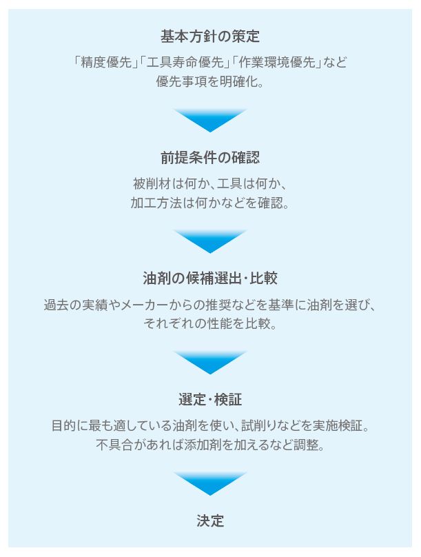 选择切削液时,需要考虑工件材料及加工方法、刀具材质、加工精度、刀具寿命、作业环境、地球环境(环保性)等诸多因素。因此,明确“精度优先”、“刀具寿命优先”、“作业环境优先”等优先顺序,并制定基本方针至关重要。