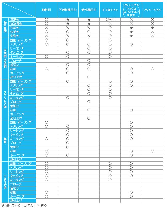 另外,不同的被削材料如下图所示,需要根据作业目的进行选择。例如,碳素钢、合金钢、铸铁、铝合金适合具有适度润滑性的油性型;不锈钢、耐热钢等容易发生熔接的被削材料适合具有优异抗熔接性的极压型。