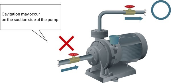 Normally, flow rate adjustment valves are always installed on the discharge side of the pump. If they are installed on the suction side, the suction pressure to the pump will decrease when the valve is closed, causing bubbles to form in the piping and making it more likely to experience cavitation (cavity phenomenon).
