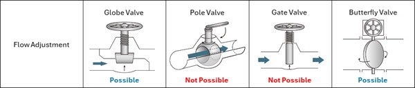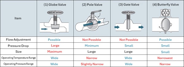 However, globe valves and butterfly valves, which are good at flow control, have drawbacks such as large pressure loss and a tendency to cause water hammer, so be sure to carefully check your company's piping situation before making a selection.