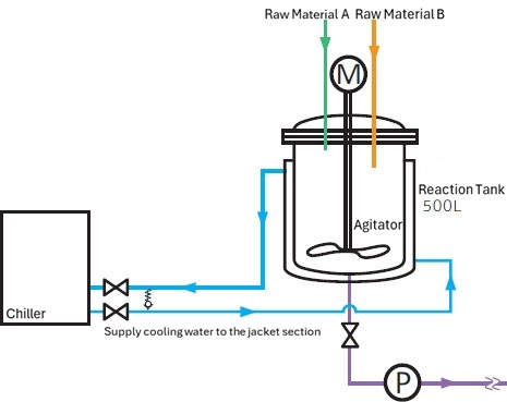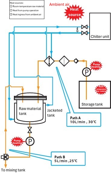 Premise: In a reaction process for mixed raw materials as shown in the piping diagram below, cooling capacity of the existing chiller is insufficient, causing the temperature of the mixed raw materials to rise. Calculate the cooling deficiency (heat amount of the temperature rise).