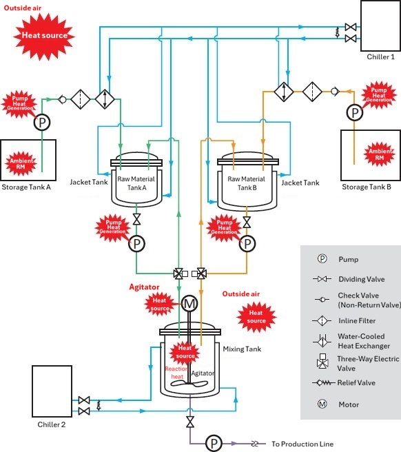 Heat sources include the heat generated in the process of adjusting the temperature of raw materials in the raw material tank, the room temperature raw materials in the storage tank, heat generated by the pump, and heat entering from the outside air.The process of creating mixed raw materials in the mixing tank also generates heat from the agitator and reaction heat.