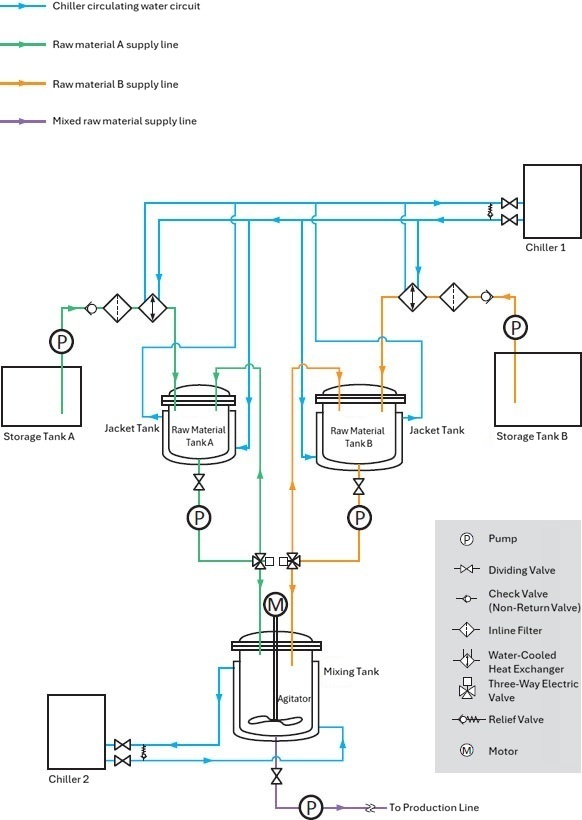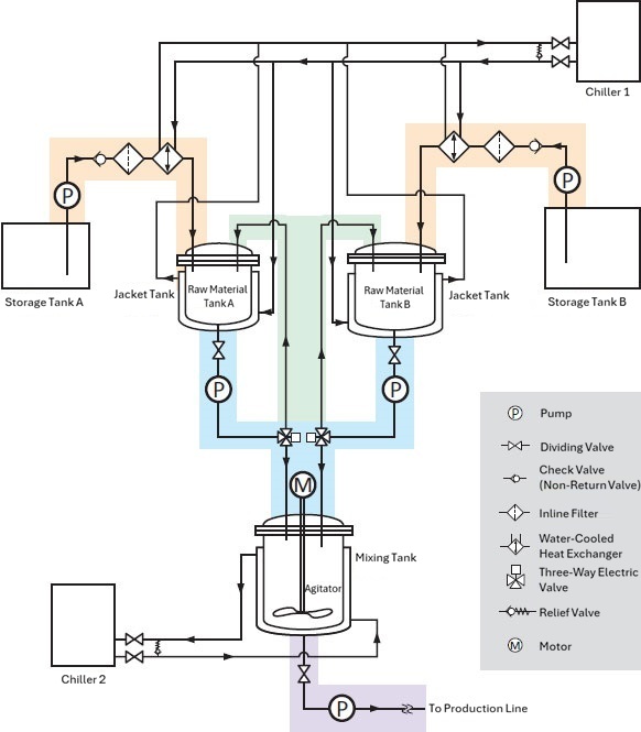In the diagram below, the orange areas indicate that room temperature raw materials are sent from storage tanks A and B to their respective raw material tanks, and the temperature is regulated by chiller 1.