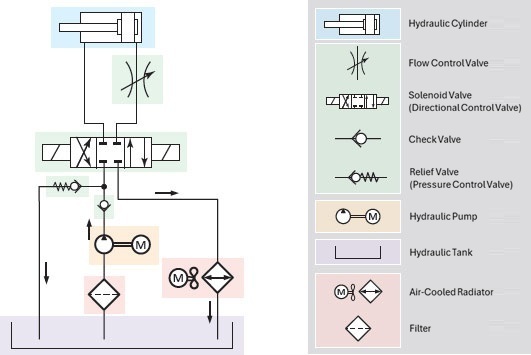 In the piping diagram of a hydraulic system circuit like the one below, you can see that the piping extending from the hydraulic actuator passes through valves such as flow control valves and solenoid valves, passes through the hydraulic pump, passes through an air-cooled radiator and filter, and flows into the hydraulic tank.