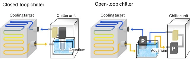 On the other hand, open circuit chillers draw in cooling water from outside, so an external water tank and piping equipment are required, necessitating a large amount of space.However, they have the advantage of being able to directly cool an open water tank, which is not possible with built-in water tank chillers, and can be low cost if you purchase a new chiller while utilizing existing equipment.