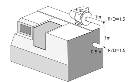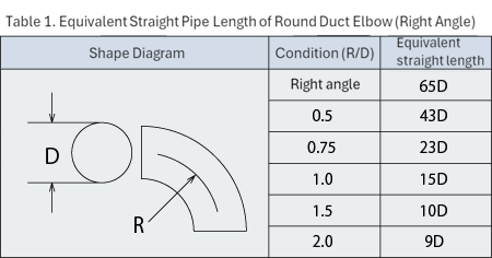 As the R/D of the bend is 1.5, the equivalent straight pipe length is 10D from Table 1. As there are two bends and the duct diameter connected to the outlet of the GME-S750-Pro provisionally selected in ② is φ125, the equivalent straight pipe length of the duct bend can be calculated as follows:
