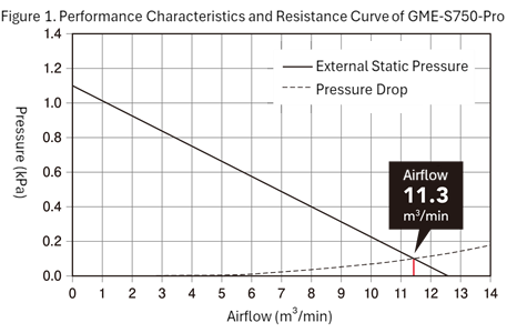 We will provisionally select a model with a maximum airflow rate that exceeds the required processing airflow rate in ①. In this case, we will select the GME-S750-Pro, which has a maximum processing airflow rate of 12.6 m³/min.