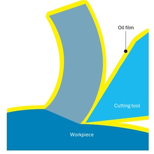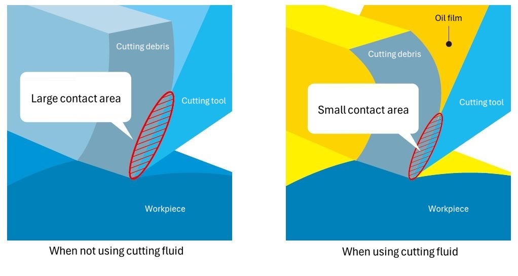 Therefore, cutting fluid is supplied to both the tool and the workpiece, creating an oil film on the metal surface to prevent direct contact between the metals and reduce friction and wear. This is the lubricating effect of cutting fluid.