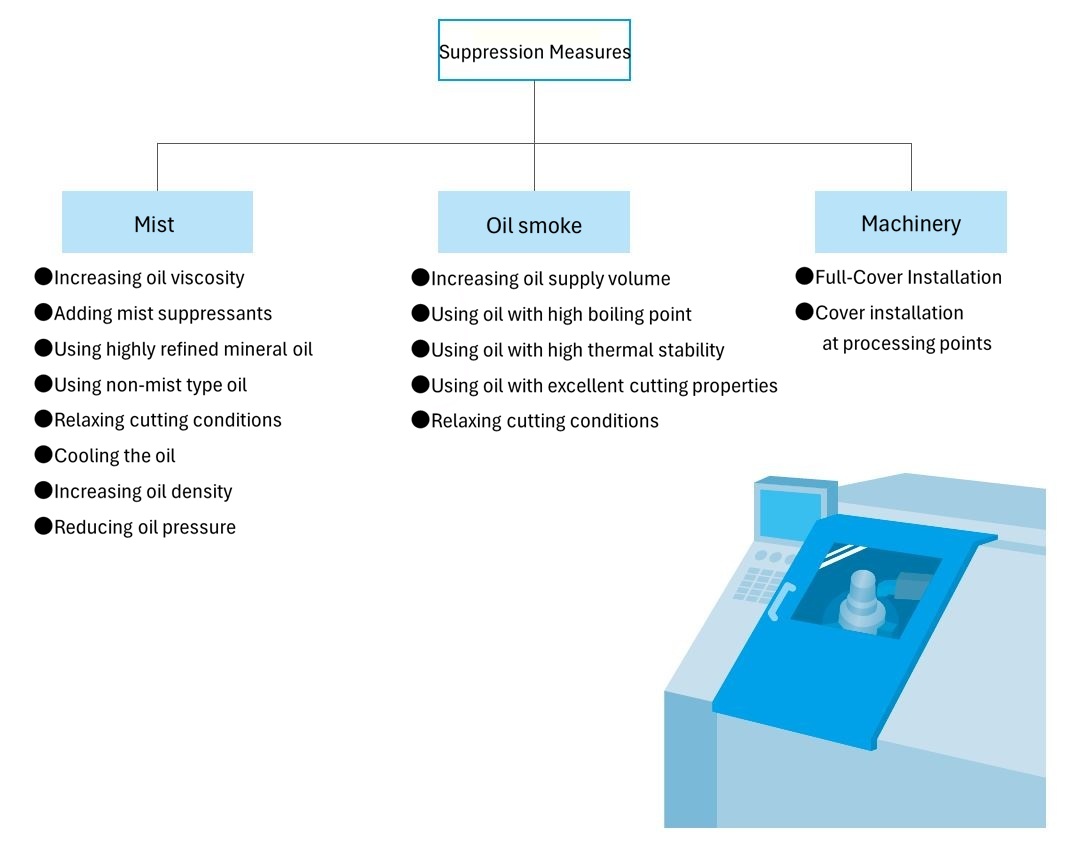 To improve the working environment, it is first necessary to suppress the scattering of cutting fluid and the generation of oil smoke. As a countermeasure, first consider reviewing the type of fluid (increasing viscosity, adding mist suppressants, etc.) and the amount supplied, as well as easing the cutting conditions. It is also necessary to cover the entire machine and the machining points of the machine.