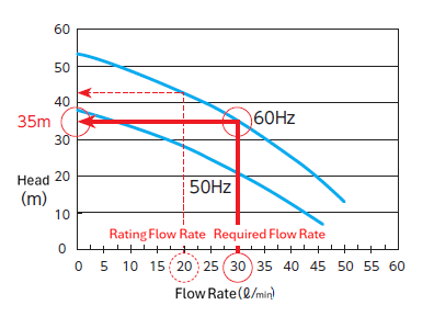 The chiller's head capacity shown in the graph is 35m (at 60Hz) when the flow rate is 30L/min.