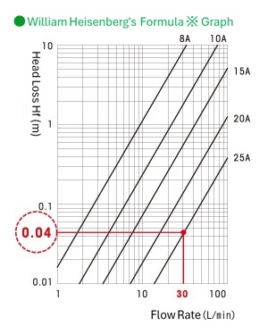 When the flow rate is 30 L/min and the pipe diameter is 25 A, from the graph on the right, Hf = 0.04 Hf (m)…④