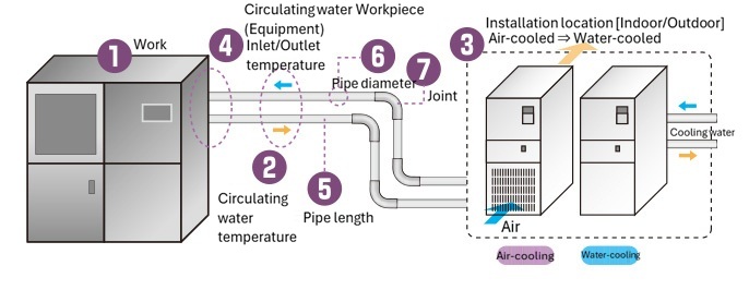 5) Determine the required "head" based on the pipe length, 6) pipe diameter, and 7) joints (number of bends), and confirm that the pump capacity of the chiller to be selected satisfies this requirement.