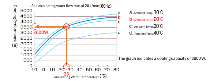 Example: Calculate cooling capacity of the PCU-3300R when circulating water temperature is 25°C and the ambient temperature is 20°C.