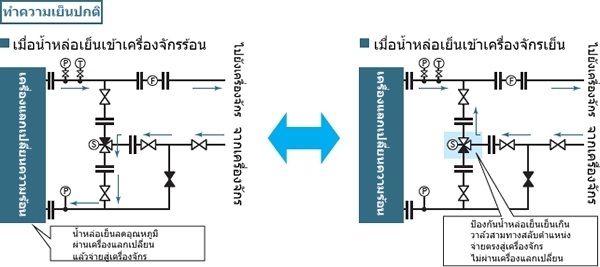 เราขอแนะนำให้สร้างวงจรบายพาสโดยใช้วาล์วประตูสำหรับการบำรุงรักษาในกรณีที่วาล์วต่างๆ เช่น วาล์วมอเตอร์และวาล์วโซลินอยด์ทำงานผิดปกติ ยกตัวอย่างเช่น กรณีที่ใช้วาล์วสามทาง (วาล์วโซลินอยด์) ในสายควบคุมอุณหภูมิสำหรับน้ำหล่อเย็นของอุปกรณ์