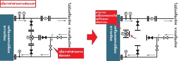 หากวาล์วสามทางนี้เสีย การปิดวาล์วประตูทั้งหมดที่ติดตั้งไว้ก่อนหน้าวาล์วสามทางก็มีประสิทธิภาพเช่นกัน การเปิดวาล์วประตูของวงจรบายพาสที่สร้างขึ้นล่วงหน้าและควบคุมการไหลของของเหลว ช่วยให้สามารถเปลี่ยนวาล์วสามทางได้โดยไม่ต้องหยุดการไหลเวียนของน้ำหล่อเย็น
