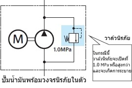 ปั๊มบางรุ่นมีวงจรระบายแรงดันในตัว ตัวอย่างเช่น ปั๊มน้ำมันในแผนผังท่อด้านล่างจะเปิดวาล์วระบายแรงดันและระบายแรงดันเมื่อแรงดันเกิน 1.0 MPa