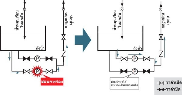 หากติดตั้งปั๊มสำรองไว้ข้างๆ ปั๊ม ก็สามารถคืนสภาพได้อย่างรวดเร็วโดยเพียงแค่เปลี่ยนวาล์วประตู และสามารถดำเนินการบำรุงรักษาได้ในขณะที่อุปกรณ์ยังทำงานอยู่