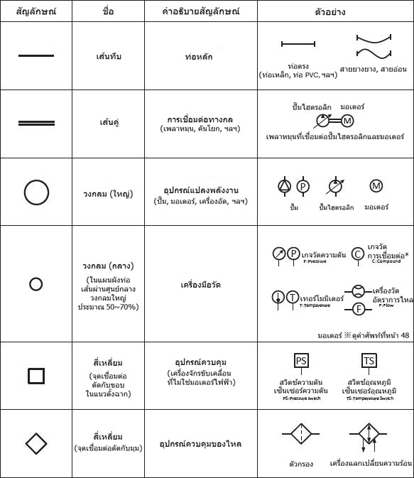 ตัวอย่างเช่น ท่อเป็นเส้นทึบ แต่เมื่อกลายเป็นเส้นคู่ จะกลายเป็นอุปกรณ์ที่เชื่อมต่อกัน เช่น เพลาหมุน และถึงแม้จะเป็นวงกลมเดียวกัน แต่วงกลมขนาดใหญ่หมายถึงตัวแปลงพลังงาน และวงกลมขนาดเล็กหมายถึงเครื่องมือวัด ระวังอย่าสับสนสัญลักษณ์ที่คล้ายกัน