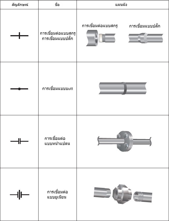 "วิธีการเชื่อมต่อท่อ" ที่ใช้กันทั่วไปสำหรับท่อส่งของเหลวจะแสดงโดยใช้สัญลักษณ์ดังต่อไปนี้