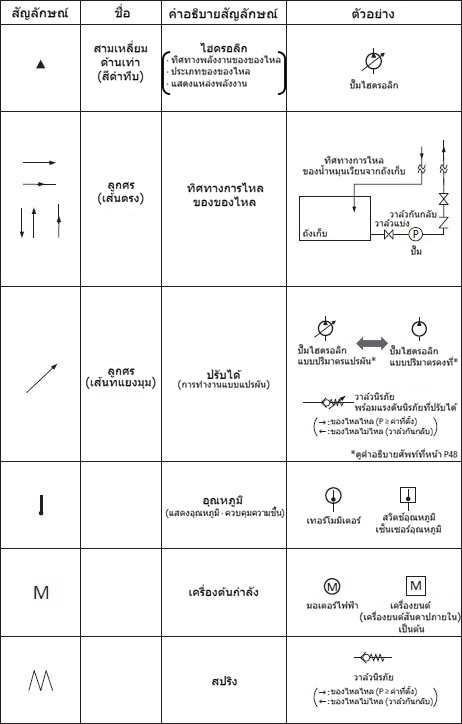 ตัวอย่างเช่น หากสัญลักษณ์ปั๊มไฮดรอลิกมีลูกศรเฉียงอยู่ด้านบน แสดงว่าปั๊มนั้นเป็นปั๊มไฮดรอลิกที่มีอัตราการไหลแปรผัน