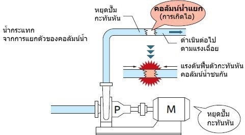เมื่อปั๊มหยุดกะทันหัน ปริมาณการไหลที่จ่ายจากปั๊มไม่สามารถตามทันของไหลที่ยังคงเคลื่อนที่ไปข้างหน้าได้เนื่องจากแรงเฉื่อย ทำให้แรงดันลดลงกะทันหันและเกิดชั้นก๊าซเนื่องจากการกระพริบ (การระเหย) สิ่งนี้เรียกว่าการแยกตัวของคอลัมน์น้ำ และเมื่อการเคลื่อนที่ของไหลในท่อหยุดลงและแรงดันกลับมาเป็นปกติ คอลัมน์น้ำจะชนกัน ทำให้เกิดแรงกระแทก