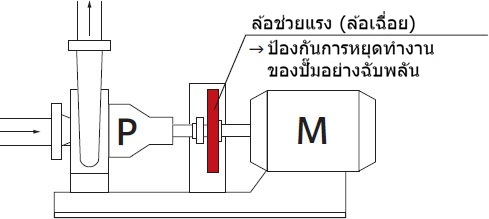 เพื่อป้องกันอาการน้ำกระแทก นอกจากการใช้มาตรการต่างๆ เช่น การเพิ่มขนาดท่อและติดตั้งเช็ควาล์ว วาล์วระบายอากาศ และวาล์วระบาย เพื่อหลีกเลี่ยงวาล์วที่เปิดและปิดกะทันหันแล้ว การติดตั้งมู่เล่เข้ากับปั๊มก็มีประสิทธิภาพเช่นกัน