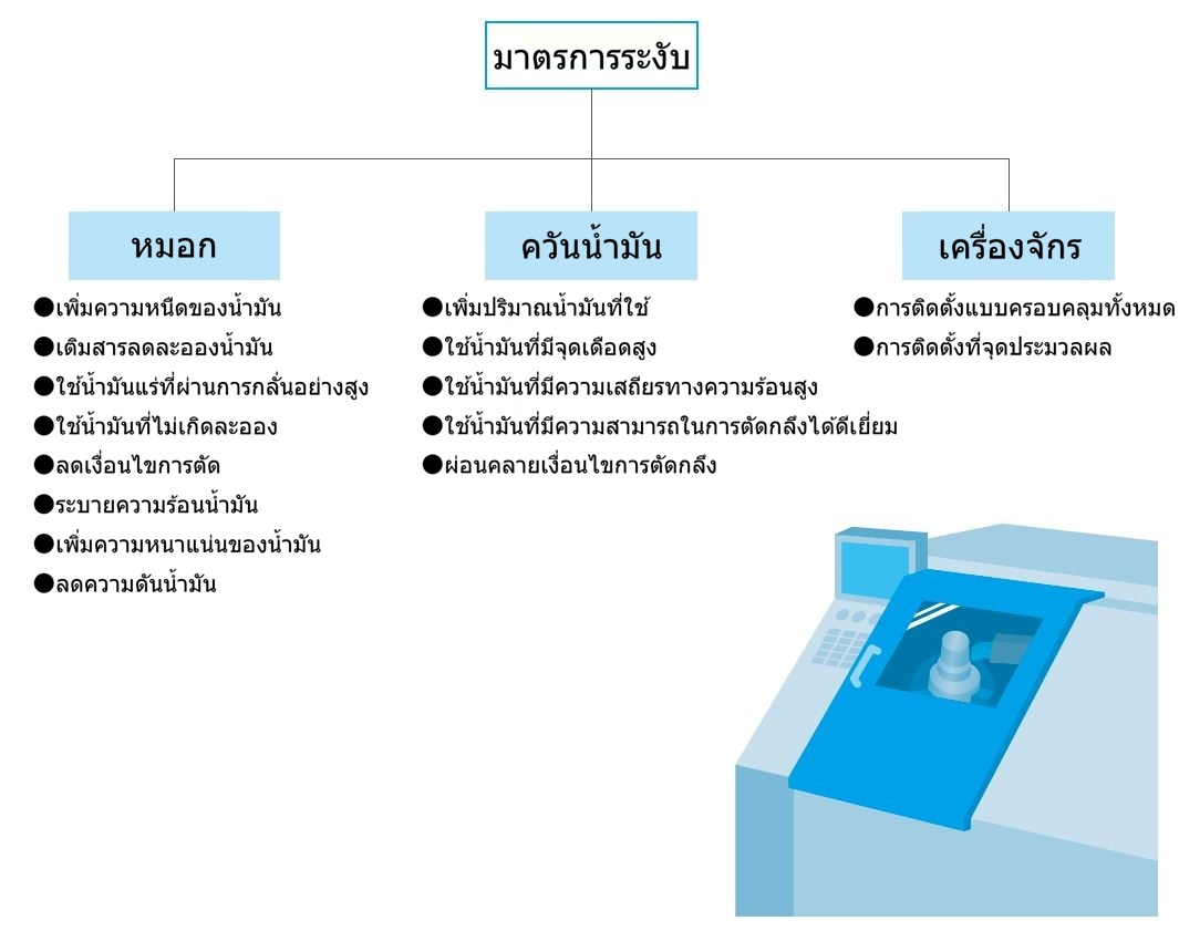 เพื่อปรับปรุงสภาพแวดล้อมการทำงาน จำเป็นต้องป้องกันการกระจัดกระจายของน้ำมันตัดและการเกิดควันน้ำมันก่อน มาตรการแก้ไขเบื้องต้นคือการพิจารณาประเภทของน้ำมัน (เช่น การเพิ่มความหนืด การเติมสารป้องกันละออง ฯลฯ) และปริมาณที่จ่าย รวมถึงการปรับสภาพการตัดให้เหมาะสม นอกจากนี้ ยังจำเป็นต้องครอบคลุมเครื่องจักรทั้งหมดหรือจุดตัดของเครื่องจักรด้วย