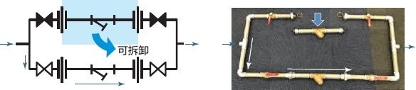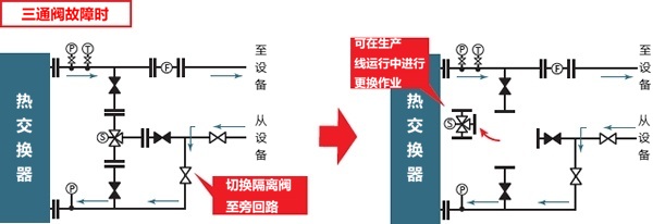 如果该三通阀发生故障,可将三通阀前面周围的所有分流阀全部关闭。通过“打开”预先制造的旁路回路的分流阀并引导流体,可以在不停止冷却水循环的情况下更换三通阀。