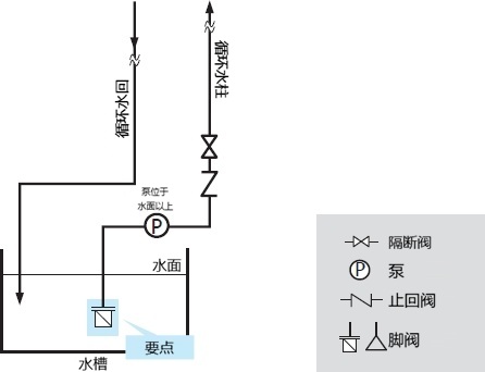 如果泵位于液槽顶部,则停止操作将导致流体从管道回流到水箱。因此,安装起到与止回阀相同作用的脚阀,防止逆流是很重要的。