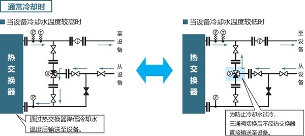 从下面的管道系统图中可以看出,冷却水通过热交换器冷却,当冷却水温度降低时,三通阀切换以防止过冷,并且直接循环到设备而不通过热交换器。