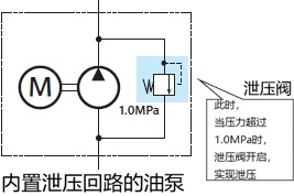 有些泵在泵内装有溢流回路。例如,下图的管道系统图中的油泵在1.0MPa或更高时会打开溢流阀并进行溢流。